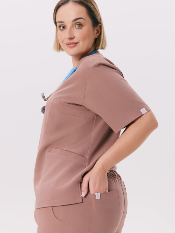 Bluzka medyczna damska Scrubs Basic Almond. Klasyczny dekolt w serek, trzy kieszenie, boczne rozporki. Komfortowa tkanina, idealna na długie godziny pracy.