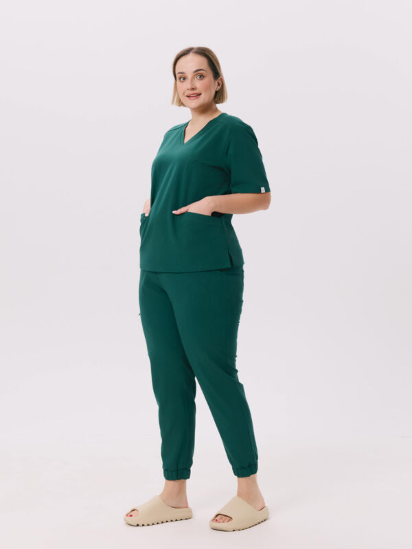 Bluzka medyczna damska Scrubs Basic Bottle Green – funkcjonalna, przewiewna i elegancka. Dopasowany krój, wygodne kieszenie i trwały materiał zapewniają komfort pracy.