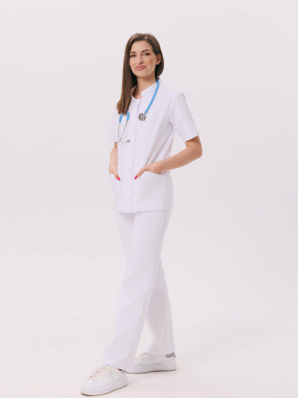 Bluzka medyczna damska Napki Premium White – elegancki fason ze stójką, zapięciem na napy i pojemnymi kieszeniami. Wygodna tkanina zapewnia komfort przez cały dzień.
