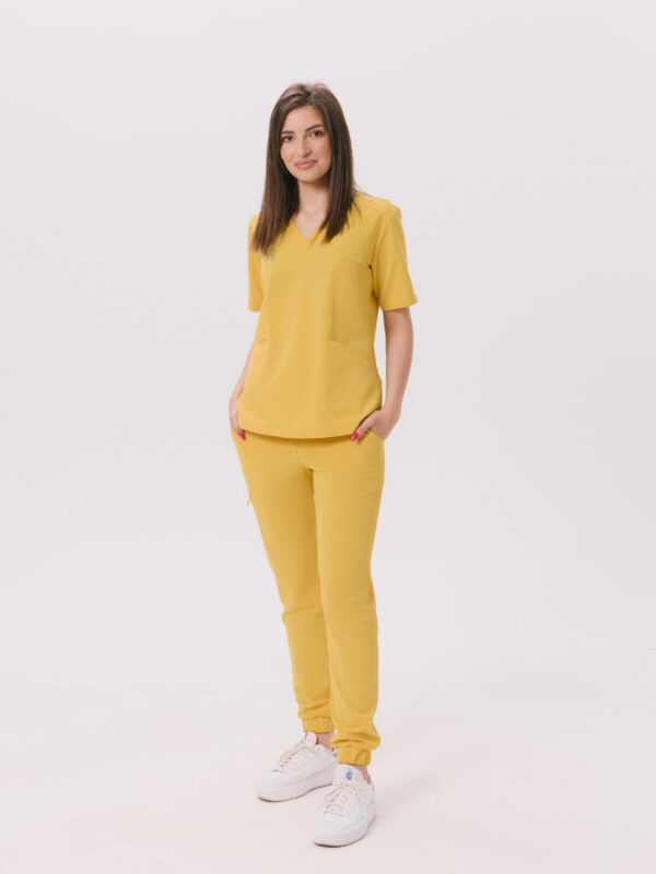 Bluzka medyczna damska Scrubs Basic Honey Yellow – klasyczny krój, dekolt w serek, trzy kieszenie i wygodny, elastyczny materiał. Komfort i styl na co dzień.