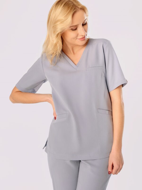 Bluzka medyczna SCRUBS BASIC w kolorze grey. Klasyczny dekolt w serek, praktyczne kieszenie i dopasowany krój zapewniają komfort przez cały dzień.
