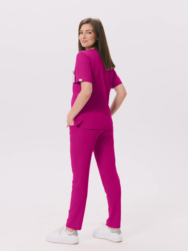 Bluzka medyczna damska scrubs w kolorze amarantowym. Trzy kieszenie, dekolt w serek, boczne rozporki. Komfortowa i trwała tkanina Basic.