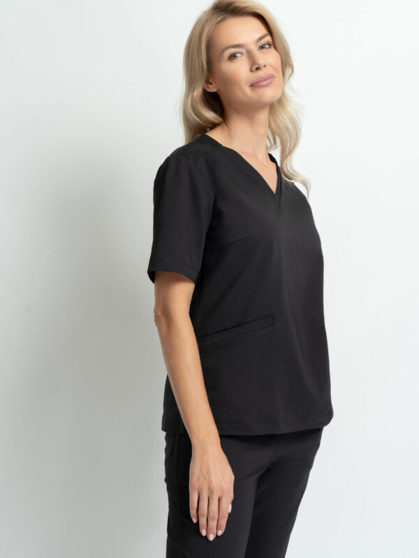 Bluzka medyczna damska scrubs w klasycznej czerni. Dopasowany krój, dekolt V i kieszenie zapewniają elegancję i wygodę. Idealna do pracy w każdej branży.