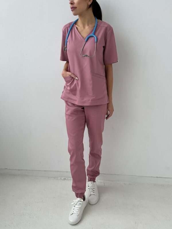 Bluzka medyczna damska scrubs w odcieniu Tibetan Rose. Elegancki krój, dekolt V i praktyczne kieszenie zapewniają wygodę i styl przez cały dzień pracy.
