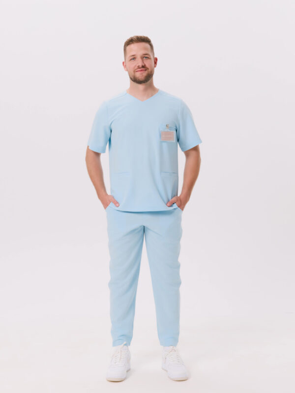 Bluzka medyczna męska SCRUBS BASIC w kolorze Clear Sky. Klasyczny fason, trzy kieszenie, boczne rozporki i lekka tkanina gwarantują wygodę przez cały dzień.