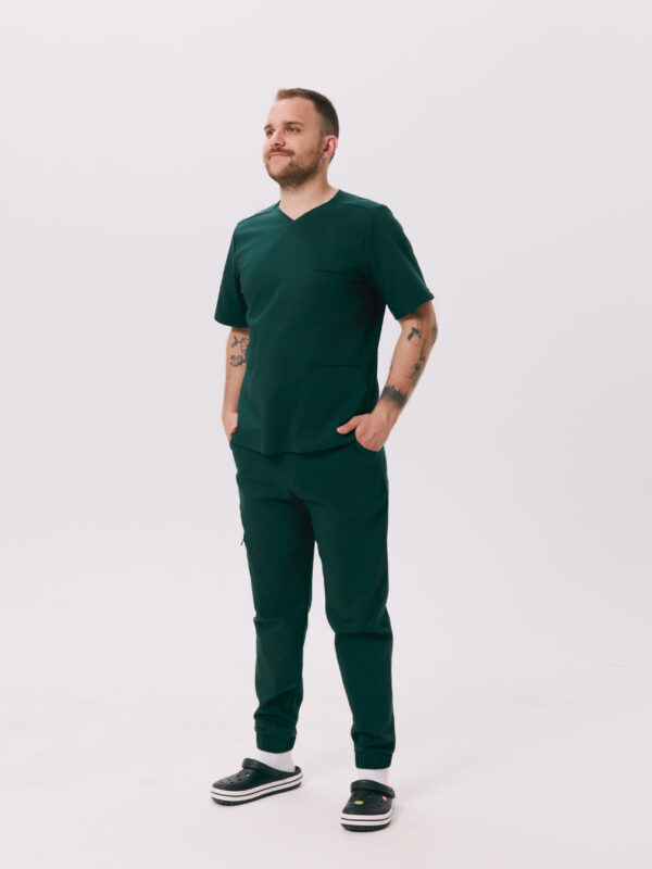 Bluzka medyczna męska SCRUBS w kolorze Forest Green. Wygodna tkanina premium, funkcjonalne kieszenie i klasyczny dekolt w serek gwarantują komfort przez cały dzień.