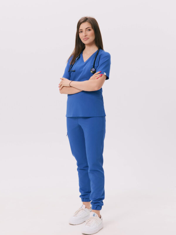 Spodnie medyczne damskie Scrubs Jogger Basic Jeans Blue – nowoczesny fason, wygodne ściągacze i elastyczny materiał. Idealne do pracy w ruchu.