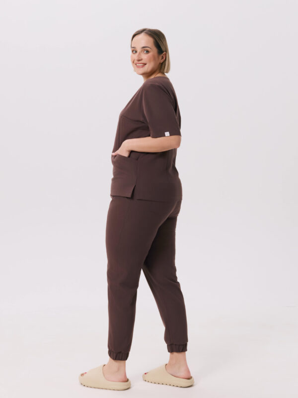 Spodnie medyczne damskie Scrubs Jogger Basic Chocolate – nowoczesny fason jogger, elastyczna talia i funkcjonalne kieszenie zapewniają komfort przez cały dzień.