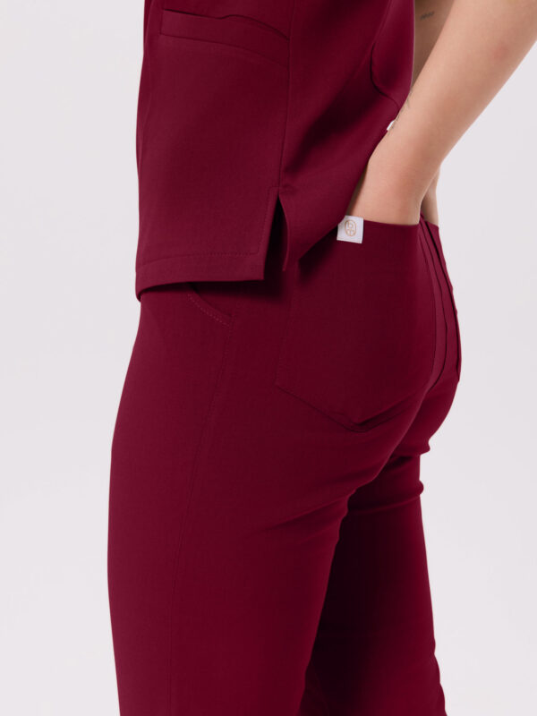 Spodnie medyczne damskie Scrubs Jogger Basic Amarant. Pięć kieszeni, szeroka guma w pasie, ściągacze na nogawkach. Komfortowy i oddychający materiał.