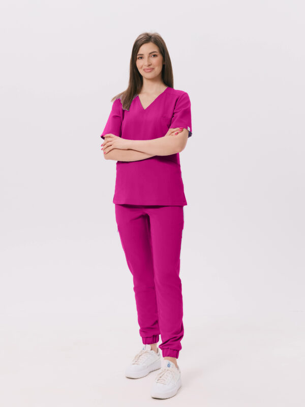 Spodnie medyczne damskie Scrubs Jogger Basic Magenta – elastyczne, wygodne i stylowe. Posiadają praktyczne kieszenie i ściągacze, zapewniając swobodę ruchu.