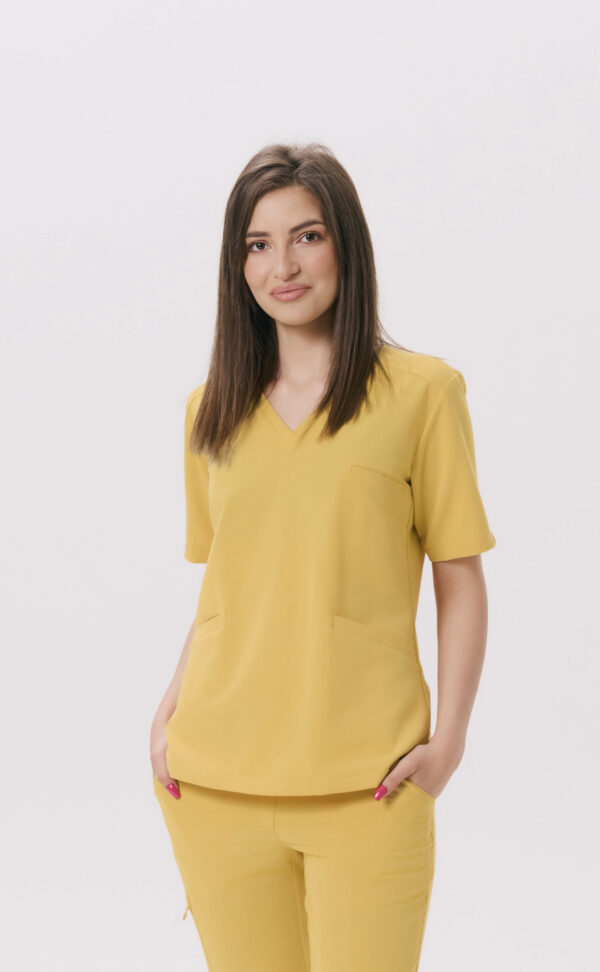 Bluzka medyczna damska Scrubs Basic Honey Yellow – klasyczny krój, dekolt w serek, trzy kieszenie i wygodny, elastyczny materiał. Komfort i styl na co dzień.