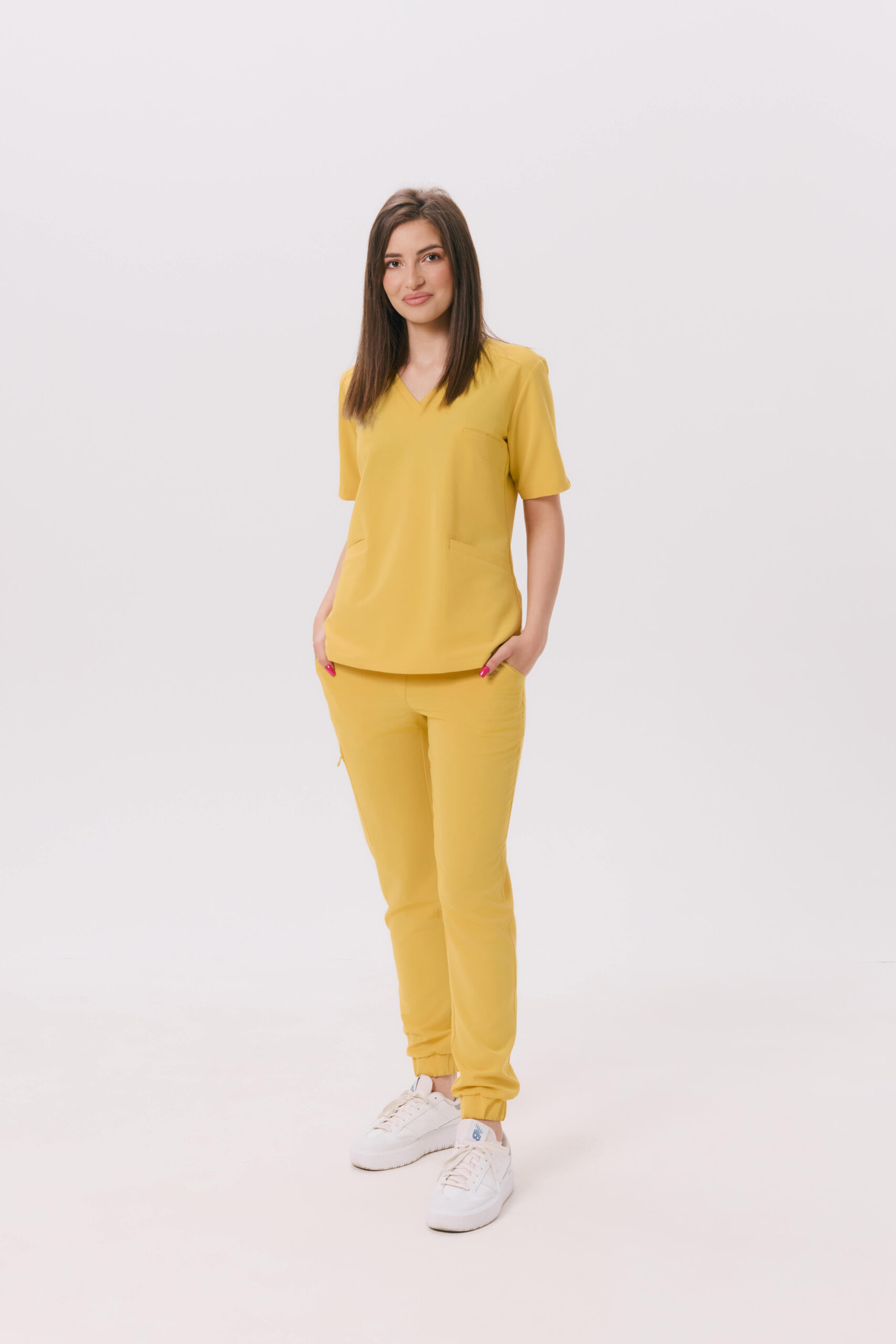 Bluzka medyczna damska Scrubs Basic Honey Yellow – klasyczny krój, dekolt w serek, trzy kieszenie i wygodny, elastyczny materiał. Komfort i styl na co dzień.