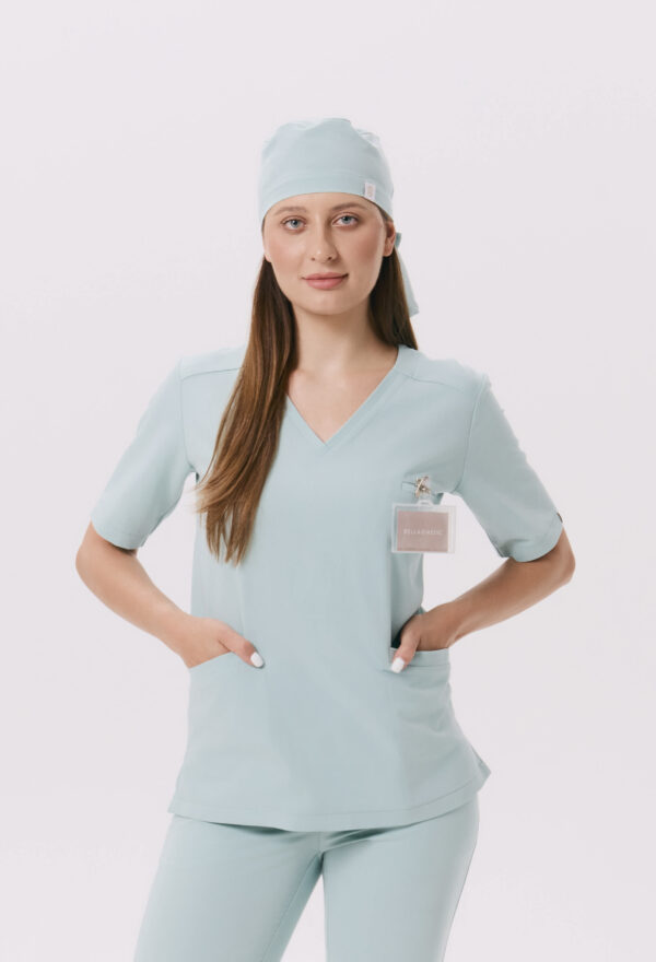 Bluzka medyczna damska Scrubs Basic Light Mint – klasyczny model z dekoltem w serek, wygodnymi kieszeniami i przewiewnym materiałem. Idealna na długie godziny pracy.
