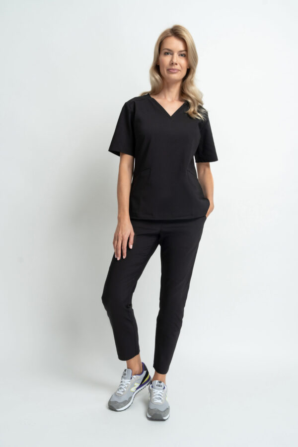 Bluzka medyczna damska scrubs w klasycznej czerni. Dopasowany krój, dekolt V i kieszenie zapewniają elegancję i wygodę. Idealna do pracy w każdej branży.