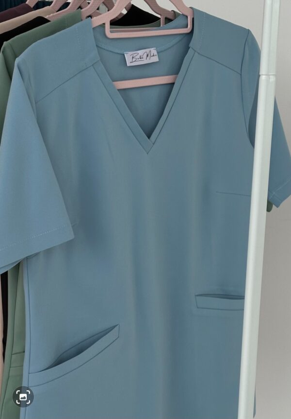 Bluzka medyczna damska SCRUBS w kolorze niebieskim. Elegancka, dopasowana i wygodna. Dekolt V, pojemne kieszenie i elastyczny materiał zapewniają komfort pracy.