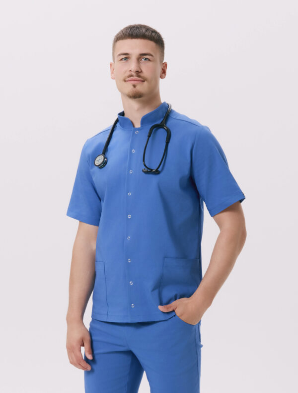 Bluzka medyczna męska NAPKI to połączenie komfortu i profesjonalnego wyglądu. Dzięki klasycznej stójce i zapięciu na napy jest idealnym wyborem dla wymagających specjalistów.